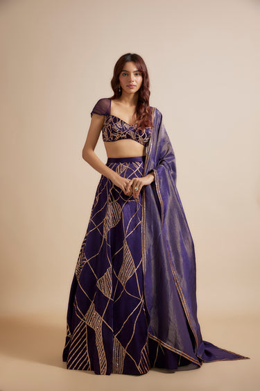 A symphony of deep indigo and shimmering gold, this lavish lehenga set exudes an air of royalty and elegance. Rich golden embroidery and delicate embellishments add a luxurious sparkle to the fitted blouse, which also has a flattering neckline. The highlight is the full, flowing lehenga skirt, which has a modern yet classic appeal thanks to its captivating geometric and abstract golden embroidery pattern that contrasts beautifully with the deep indigo fabric. A matching dupatta in a complementary indigo shade, trimmed with delicate gold detailing that permits elegant draping, completes the ensemble.