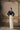 The jacket's design is marked by its sharp collar and lapels, subtly edged with a contrasting lighter trim, and a tailored silhouette that ends above the waist. It pairs seamlessly with the unique white draped skirt, which showcases an . pleated or ruched detail at the waist.