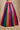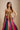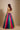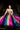 Color and sparkle are celebrated in this lively and playful ensemble. With its distinctive gold-toned bustier and large, oversized bow detail at the front, the top exudes whimsical glamour. The full, voluminous skirt, with its striking vertical stripes in a vibrant color scheme of fuchsia, teal, purple, and shimmering gold, is the true show-stopper. The ensemble really stands out thanks to the dynamic and striking effect created by each stripe. A festive and opulent atmosphere is produced by the combination of vibrant hues and shimmering gold stripes.