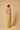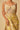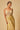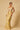This stunning dress has a fitted, embroidered bodice that is light, possibly off-white or very pale yellow, and is embellished with intricate embroidery or beadwork that gives it a textured, nearly pearl-like appearance. Additionally, the straps are adorned. The skirt is a floor-length, flowing garment with a yellow base color and an abstract, painterly print that combines brown, green, or rust hues to produce a distinctive, artistic effect. It has a draped detail at the waist, possibly with a subtle embellishment, and a high slit on one side.